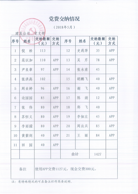 建發(fā)公司黨支部2018年5月份黨費(fèi)交納公示